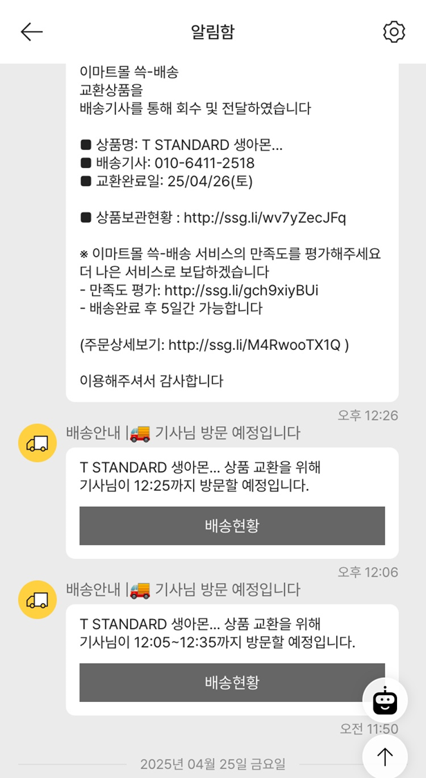 그래서 SSG 고객센터에 문의를 했습니다. 제품 상태가 너무 안 좋아서 먹기 어렵다고 말씀드렸고, 다행히도 교환이 가능하다고 하시더라고요. 생각보다 빠르게 응대해주셔서 좋은 인상을 받았습니다.